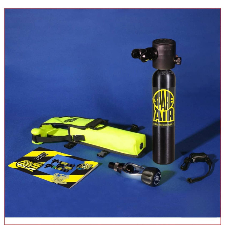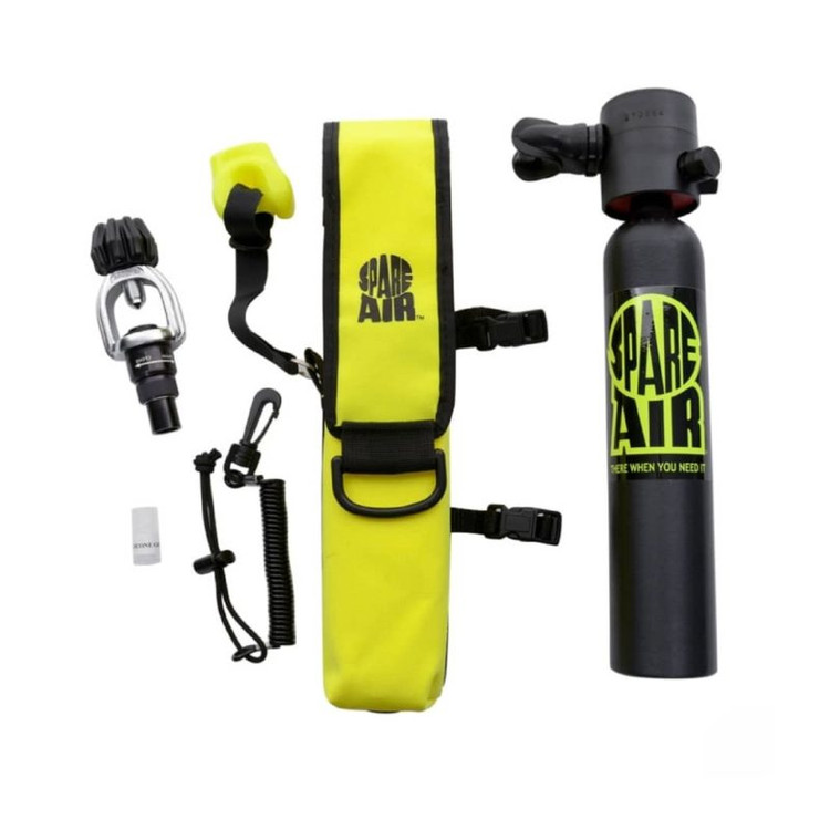 اقلام موجود در بسته: سیستم Spare Air مدل 300 مشکی، آداپتور پرکننده، کیف زرد و بند تانک
