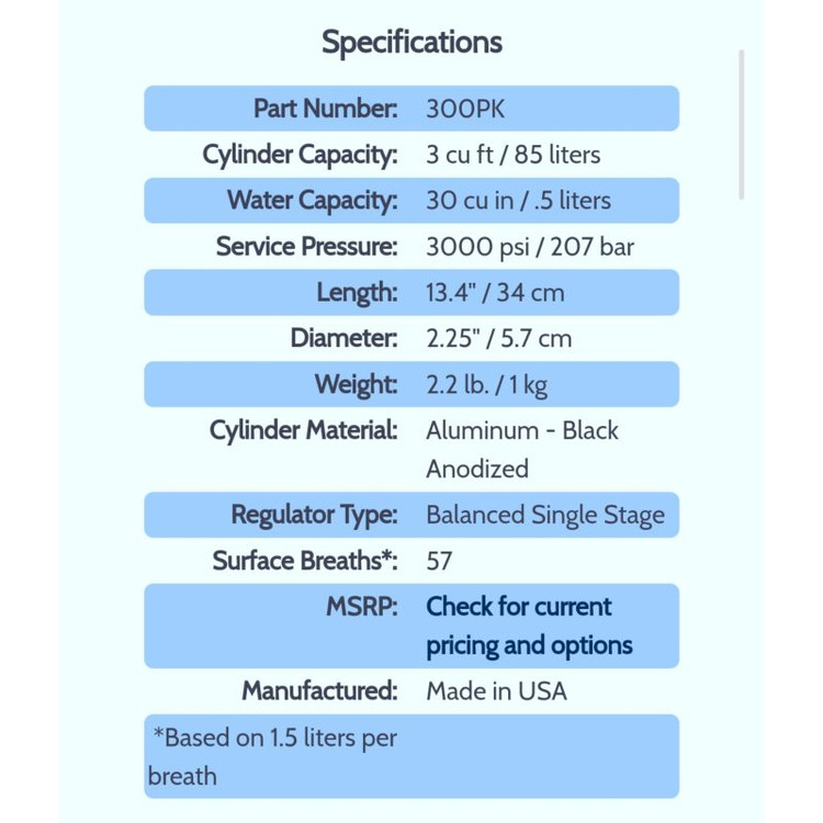 پکیج سیلندر پونی مدل 300 از برند Spare Air، یک سیستم ذخیرهی هوای اضطراری است که استفاده از آن آسان بوده و در مواقع قطع هوا خوشحال خواهید شد که آن را دارید. نیازی به فشردن دکمه یا چرخاندن پیچ نیست، فقط کافی است دهانگیر را گاز بگیرید و هنگام نیاز، نفس بکشید. با داشتن 3.0 فوت مکعب هوا، سیلندر پونی Spare Air تقریباً 57 تنفس در سطح دریا فراهم میکند (تعداد واقعی تنفسها بسته به فرد و عمق متفاوت است). پر کردن Spare Air از یک سیلندر غواصی پرشده با فشار 3000 psi با استفاده از آداپتور پرکنندهای که همراه هر واحد ارائه میشود، آسان است.