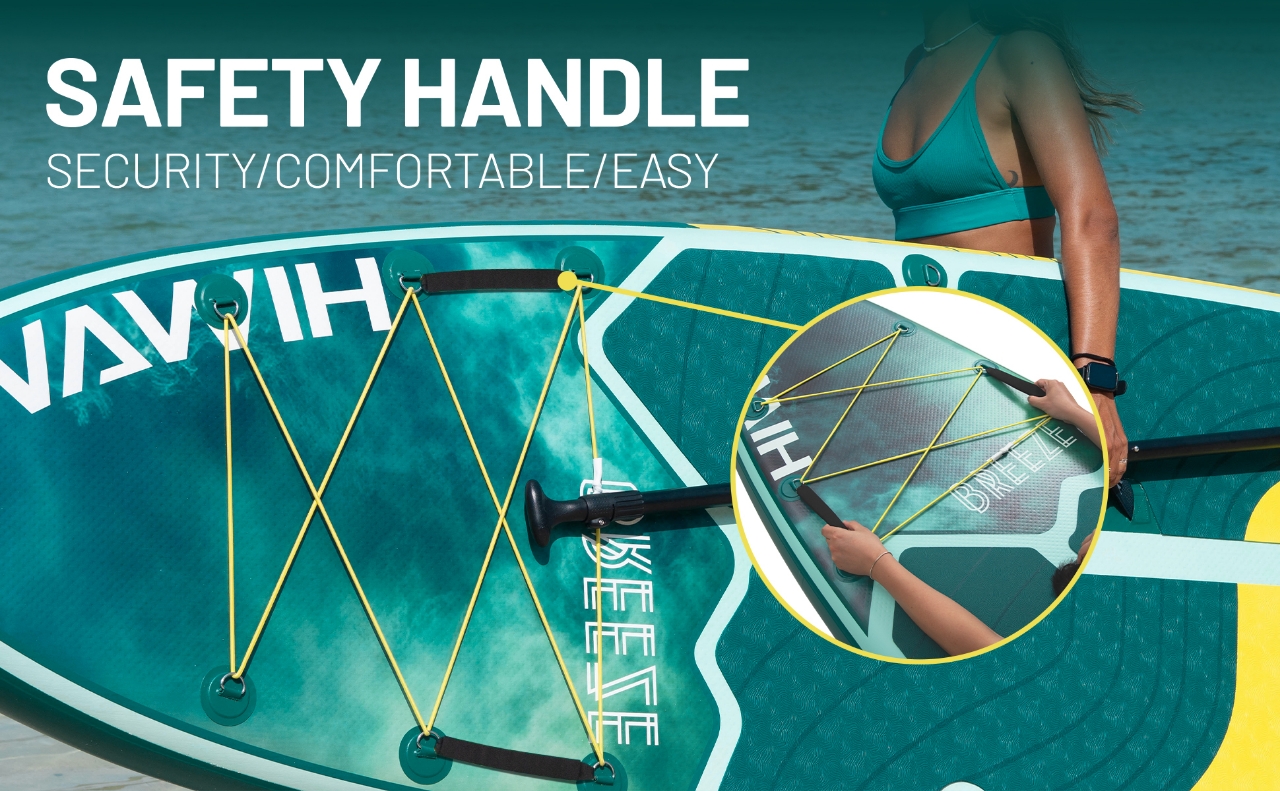 دو دسته ایمنی در جلوی تخته پدل بورد هایویو وجود دارد. زمانی که افراد در جلوی تخته مینشینند، میتوانند برای اطمینان از ایمنی، این دستهها را بگیرند.