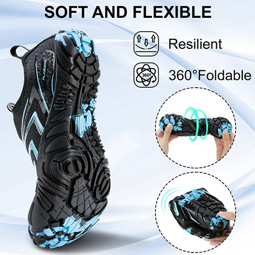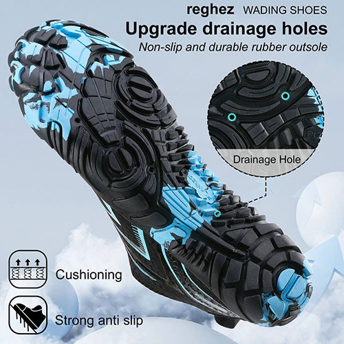 • زیره ضد لغزش: کف لاستیکی مقاوم با چسبندگی بالا، مناسب برای سطوح مرطوب و لغزنده مانند صخره، ماسه و کف رودخانه.