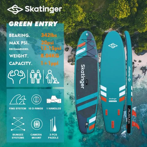 JADE – Skatinger Accessories: stand up paddle board INC:3 fin; 3 pcs height-adjustable aluminum paddle;carrying bag;high pressure pump;repair kit leash Size:10.6′-32″-6″ NW: 12.7kgsFGW: 14.7kgs,MaxLoad:150 kgsMax P